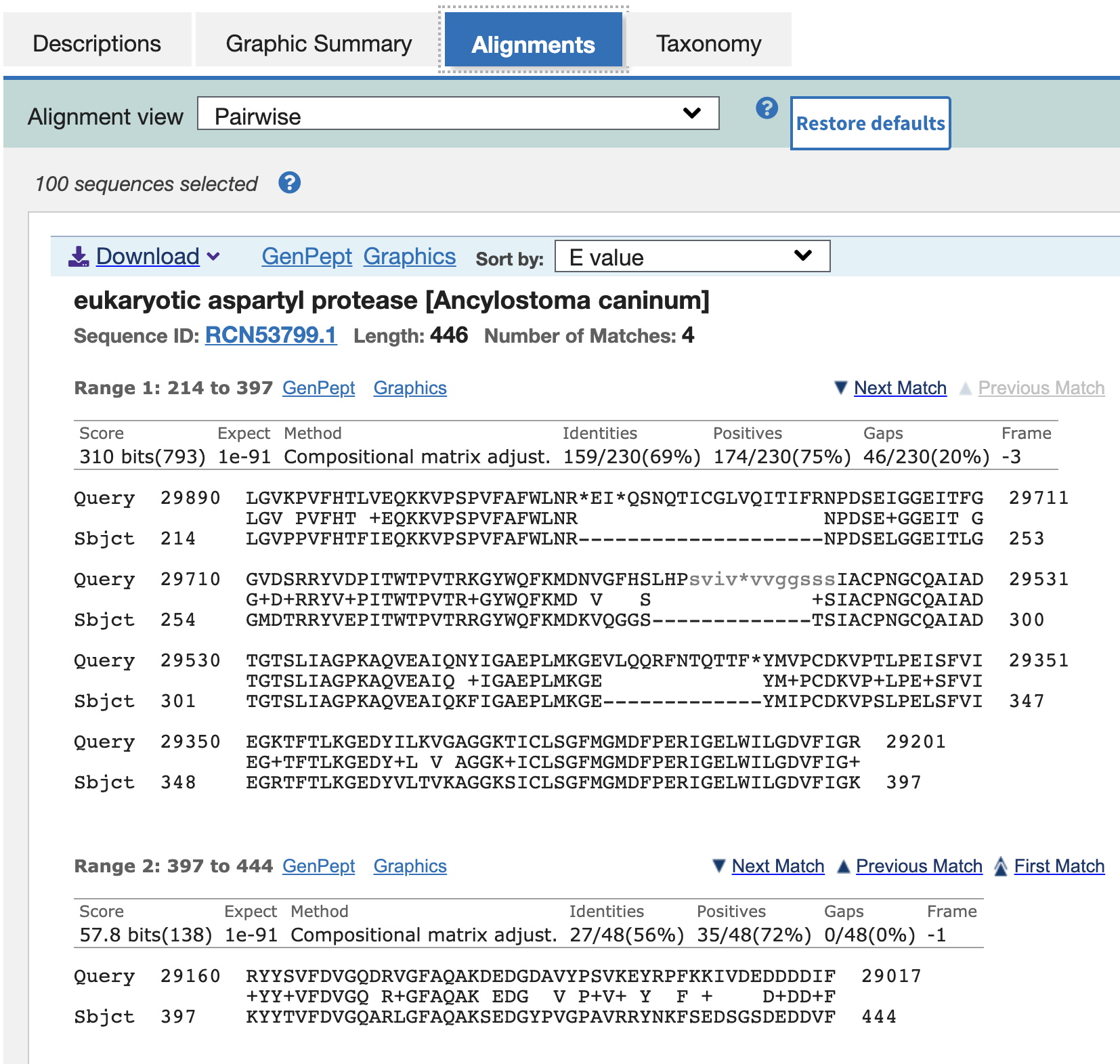 If you select the Alignments tab, you will see protein sequence alignments of translated protein sequences from ORFs in your sequence aligned with those of other organisms - the blast hits - starting with the highest scoring match. Note in this case it is in the ~29,000 bp region (red high-scoring matches in the graphical view). The first alignment starts at 29017 (see the end of the 'Range 2' alignment, the Query sequence). [Here we're showing the 2nd highest match, which has a meaningful description (eukaryotic aspartyl protease), rather than 'unnamed protein product.']