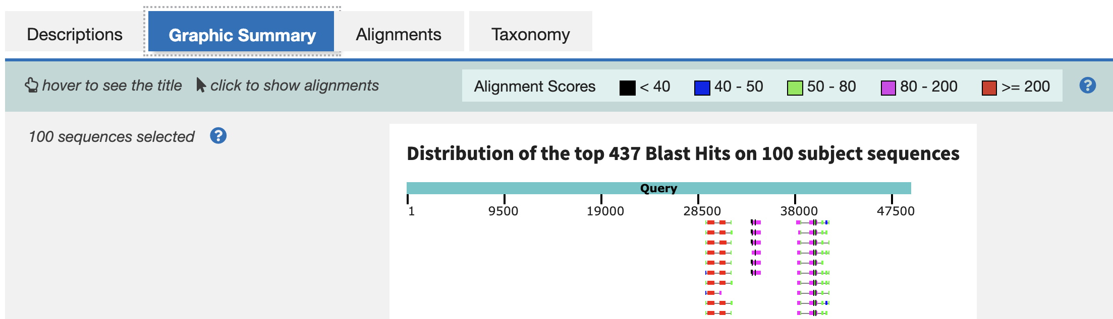 Now, select the Graphic Summary tab. (Note the color indicates the strength of the match, as shown in the key above.) Screenshot this portion of the Graphic Summary for a good overview of blast hits in your genomic sequence.