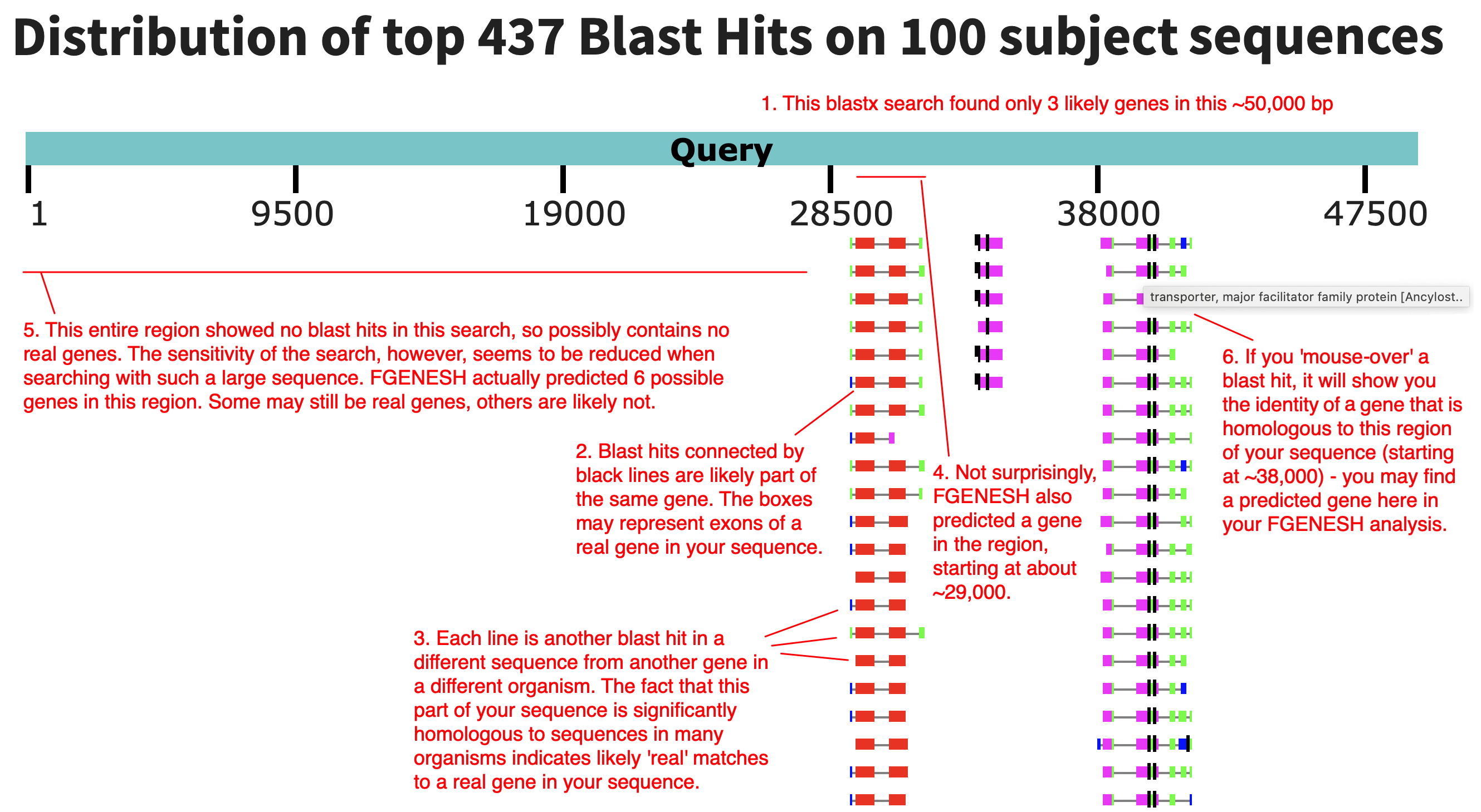 Using BLASTX on a large sequence (~50,000 bp) that compares everything at once can be a bit overwhelming initially - and, may be less sensitive than searches with smaller bits of sequence. The method below (7B) searches for matches to your predicted proteins one at a time.
