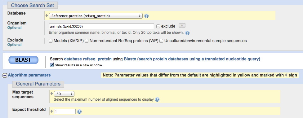2. Choose your assigned genomic sequence to upload. Change the Database to 'Reference proteins (refseq_protein).' Enter 'animals' in the Organism box (as shown below). We also need to change some default parameters - see the image below for the changes - they are highlighted in yellow, as they will be when you make the changes. First, change the database, and then click on Algorithm Parameters to make the other changes. Change the Max target sequences to 50, and Expect threshold to 1 (as shown below).