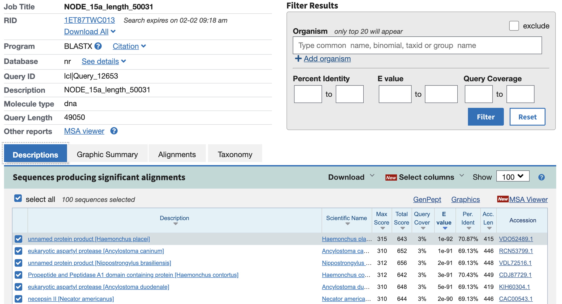 The intial result will look something like below, showing names for the other animal sequence that are homologous to parts of your large sequence in the Descriptions tab.