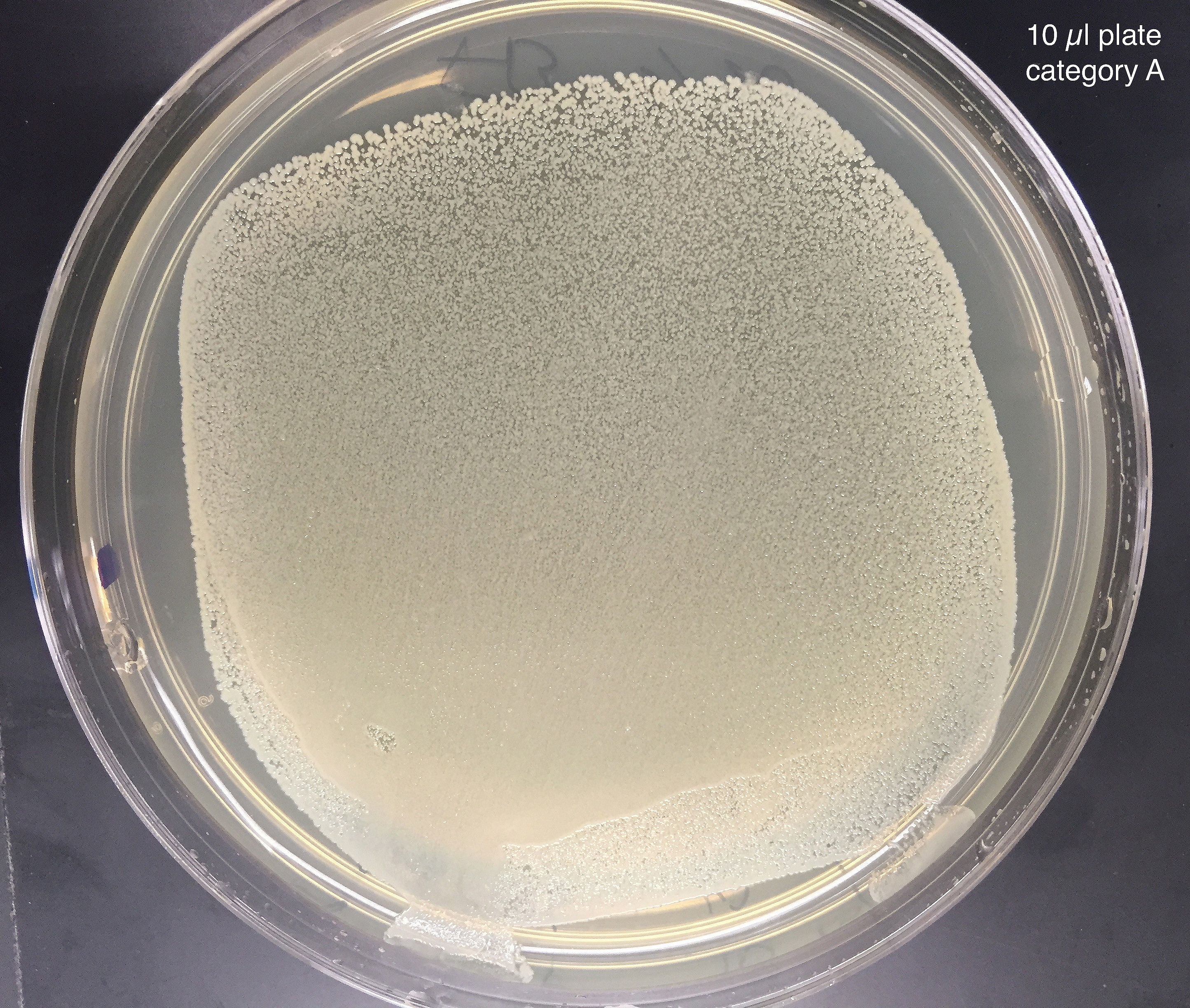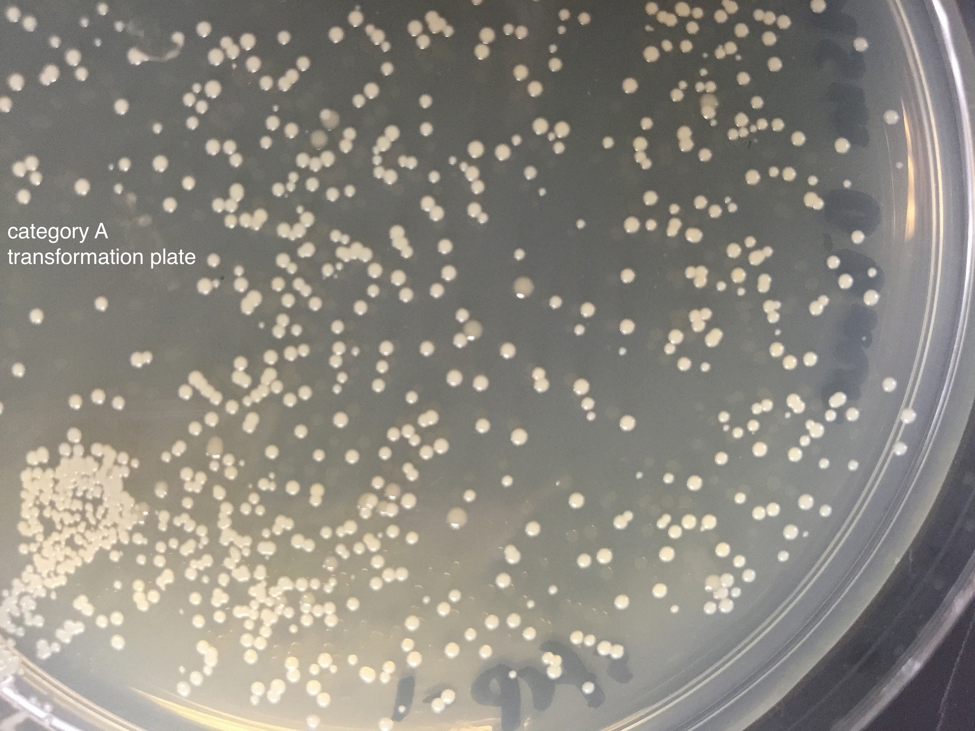 | Closeup of a less dense transformation plate is shown at right. Respreads from this plate had the same appearance as the category A respread plate above, and yielded category A type DNA.