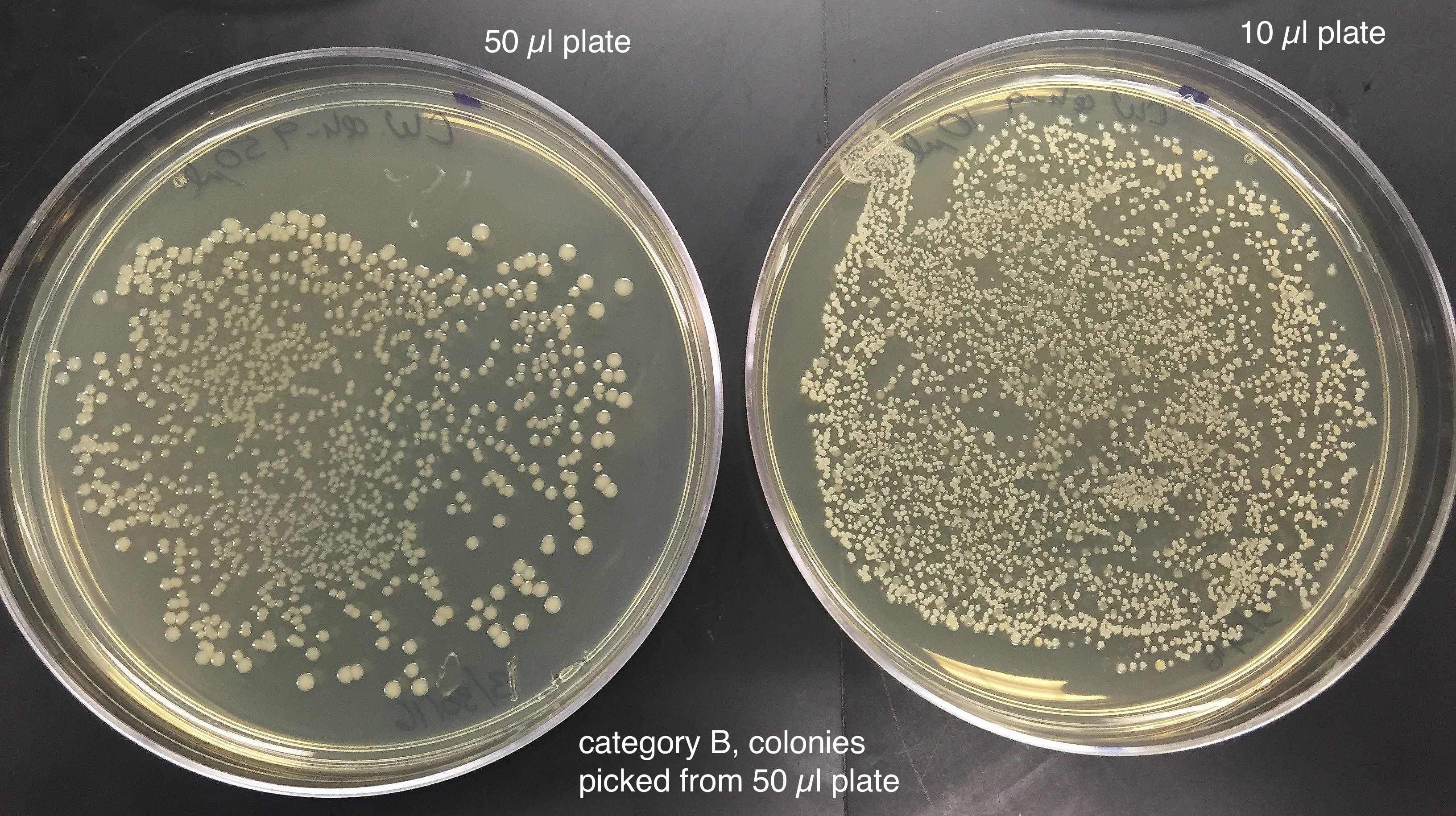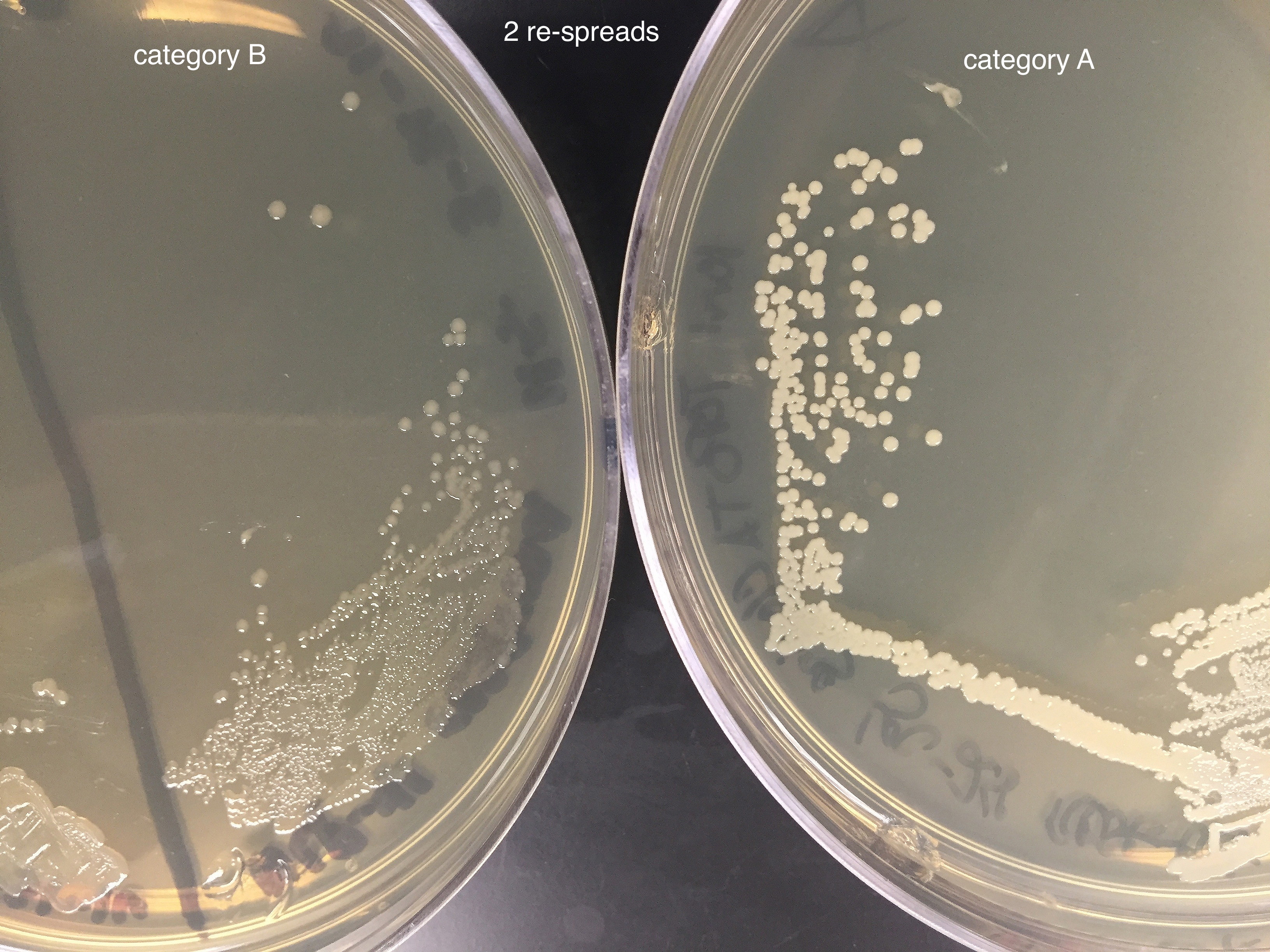 | Going back to examine the bacterial respread and transformation plates, we observed the following - all category A clones have the appearance on the right in respreads; category B clones look like those on the left.