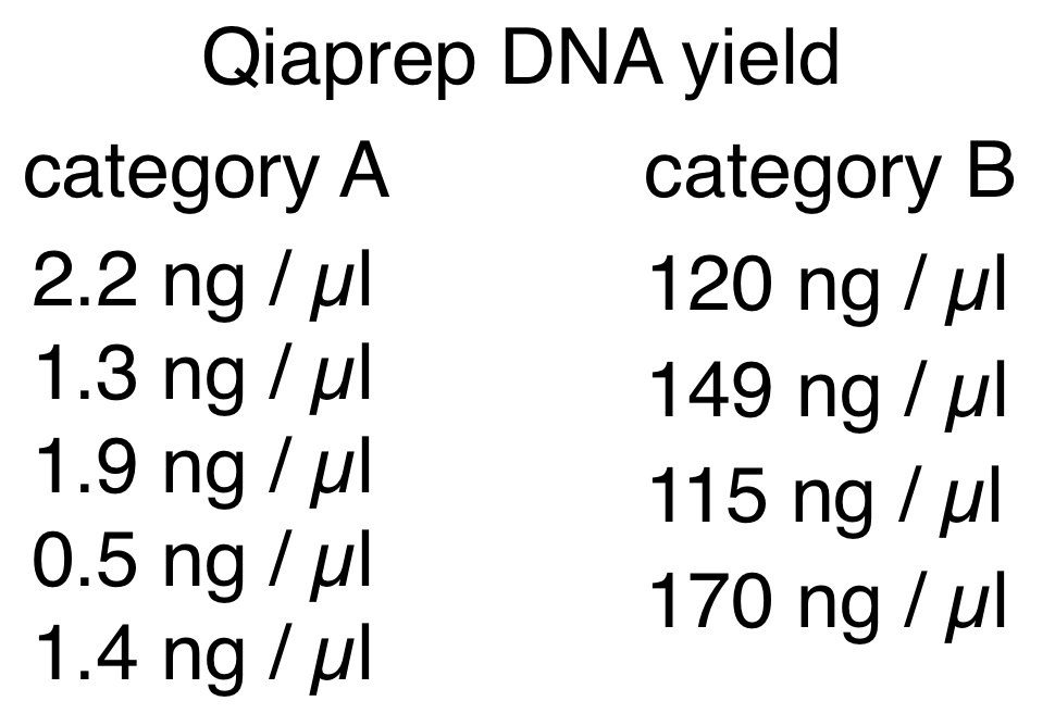 Some transformations yielded colonies that when respread, cultured, and plasmid DNA purified gave the expected result - plenty of plasmid DNA. Others did not. To find out what happened, we investigated further. Nine different clones from transformation respreads by various students were grown as overnight cultures, and DNA purified by a plasmid miniprep. The results from these fell into two distinct classes (designated category A and B). DNA concentrations for the two categories are shown at right. |
