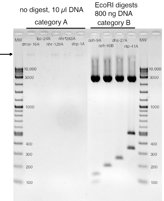Run on a gel, the DNAs appear as shown at right. As indicated above the gel photo, 800 ng of category B DNAs (all from different cloning reactions) were digested with EcoRI to test for the presence of an insert in the vector - the expected result. Some category A DNA (not digested) was run simply to examine its nature. The arrow shows that category A DNA. Question - what could this DNA be, given its molecular weight? [Note that one often sees DNA like this in a plasmid miniprep, as an undesired contaminant.] [MW - molecular weight marker is NEB 2-log ladder.]