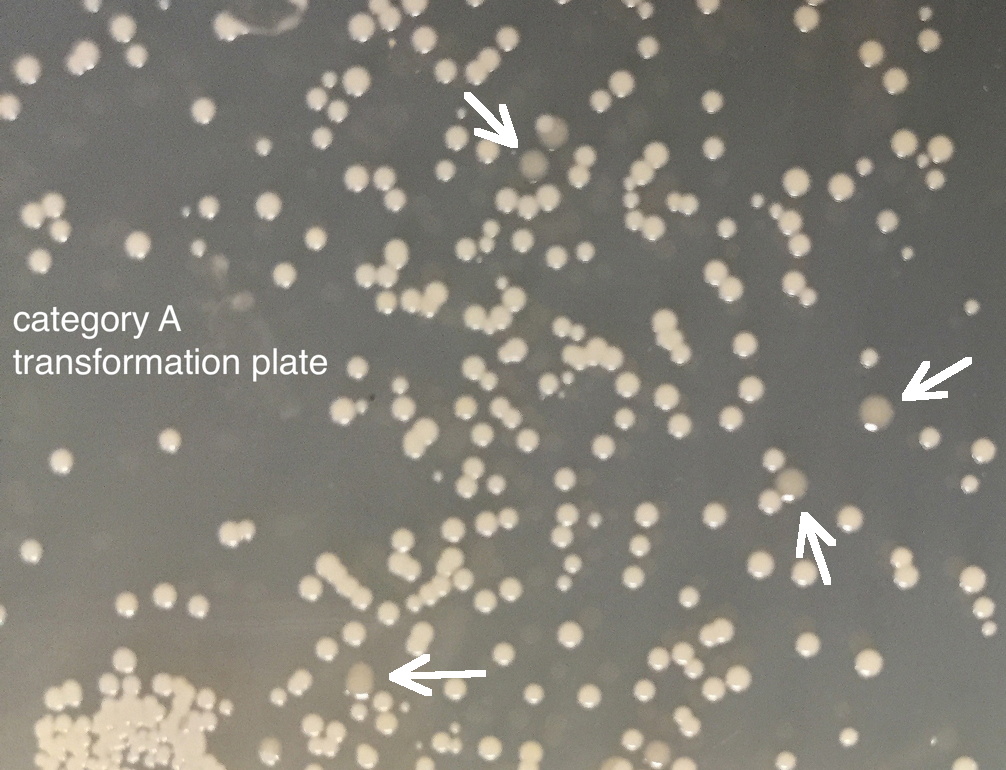 | Closer view of above plate. To test a hypothesis, specific colonies (like those indicated by the white arrows at right) were selected from three different 'category A' transformation plates.