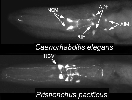 Serotonergic neurons in the heads of C. elegans and P. pacificus (data from Rivard et al., 2010).