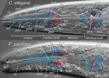 Cells of the pharynx in C. elegans and P. pacificus; neurons indicated in red (Fig. 1 C, D from Bumbarger et al., 2013).