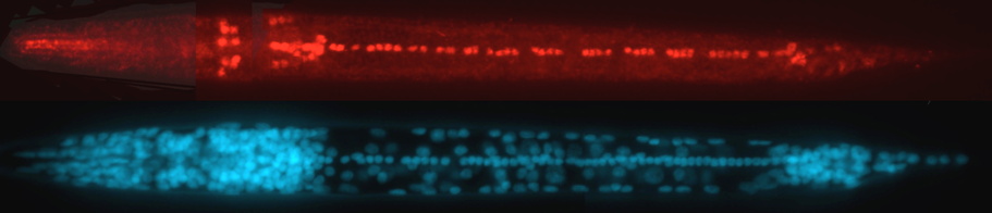 Image below: Ventral view of Pristionchus larva with protein marker-tagged Ppa-unc-3 gene (via CRISPR/Cas9, strain by H. Witte of Sommer lab). Top - neuronal nuclei (red) expressing Ppa-UNC-3 protein. Bottom - same worm showing all nuclei, stained with DNA stain DAPI. The head of the worm (left) contains the 'brain' with >100 neurons, including many expressing unc-3. The ventral nerve cord, also with many neurons expressing unc-3, is apparent on the ventral midline of the body running from the head to the tail (right) which has another cluster of many neurons.