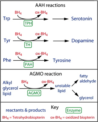 In order to synthesize both serotonin and dopamine, animals require a chemical called tetrahydrobiopterin (BH4) or biopterin. This enzymatic cofactor is usually synthesized by