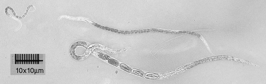 We sometimes collect nematodes in the wild (or are given them) and find interesting worms. For example, USD Microbiology students found some worms in the top layer of a Winogradsky column made using San Diego River mud and gave them to us. This fascinating nematode (below) is a Propanagrolaimus sp. that subsequently appeared in a publication with the Schierenberg lab, and soon will have its complete genome sequenced by Philipp Schiffer's lab (Univ of Cologne, Germany). Amazingly, its closest known relative is found in an underground cave river in Romania...