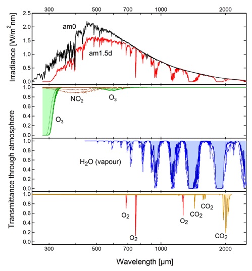 Figure 2, A comparison of the AMO and AM1-5d spectrum, indicating sources of absorption in the earth's atmosphere, and on the bottom, The AM0 spectrum (black line) vs blackbody radiation at 4550 K, 5775 K and 6500 K.